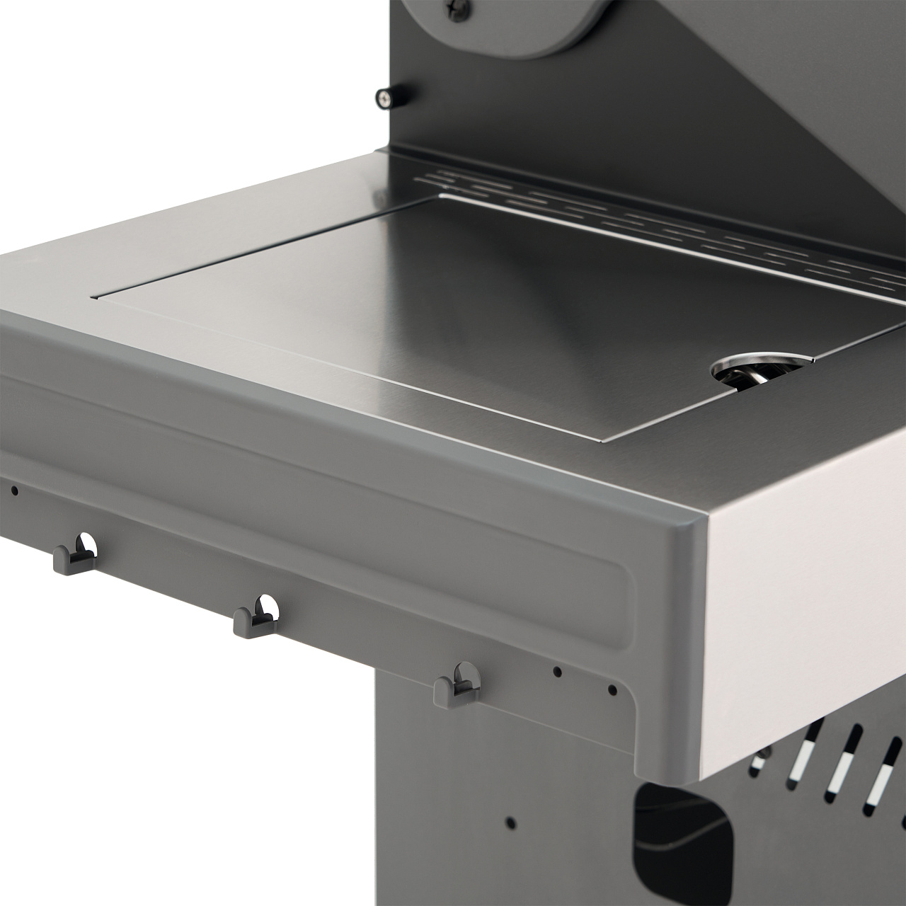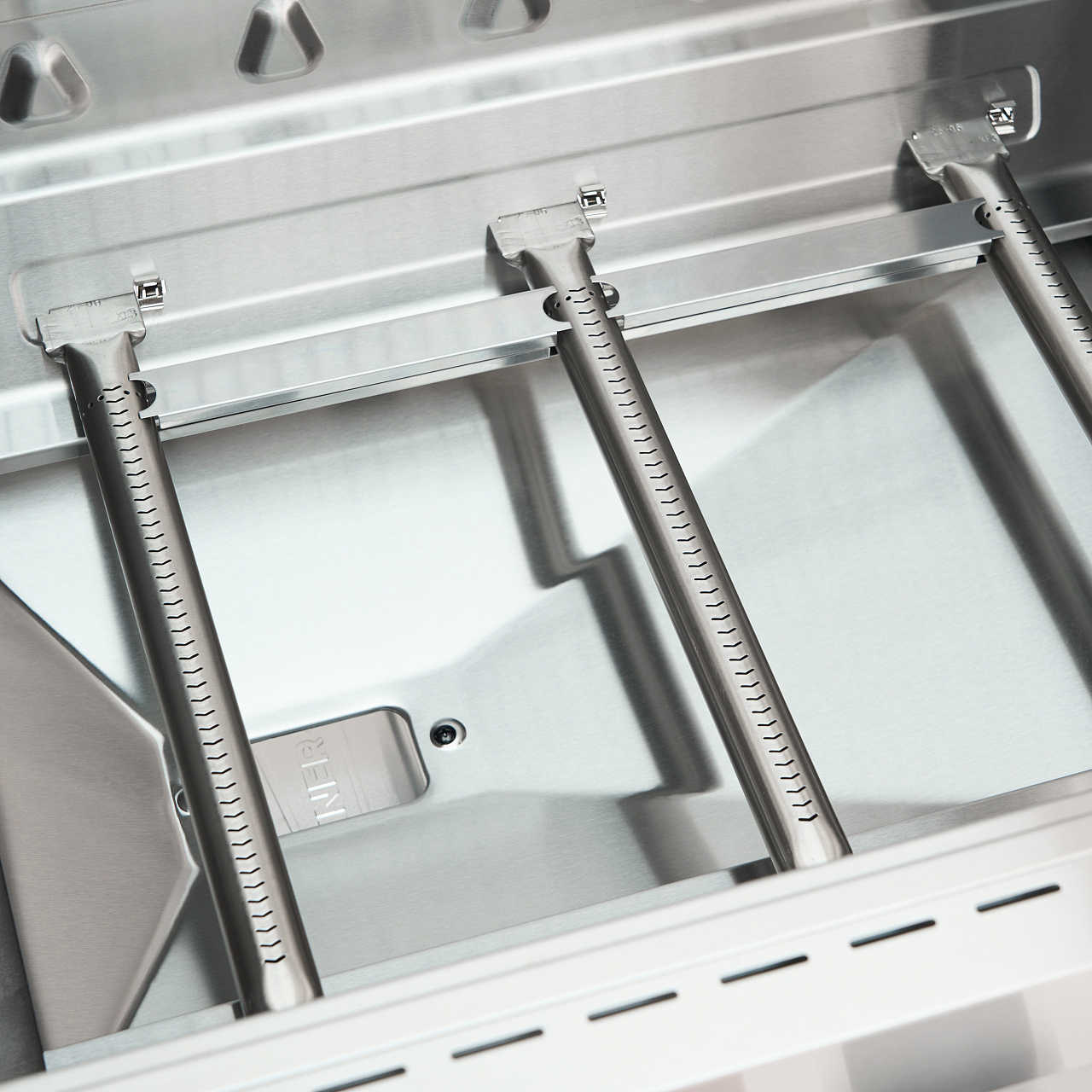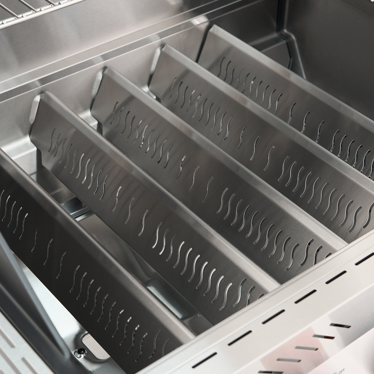 Мощные запатентованные турбогорелки BLADE™ разгоняют гриль до 300 градусов за 10 минут. В левом пристолье установлена боковая инфракрасная горелка BROIL ZONE™. Как и у всех топовых грилей, основная решетка выполнена из нержавеющей стали толщиной 8 мм.