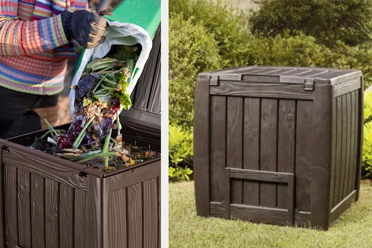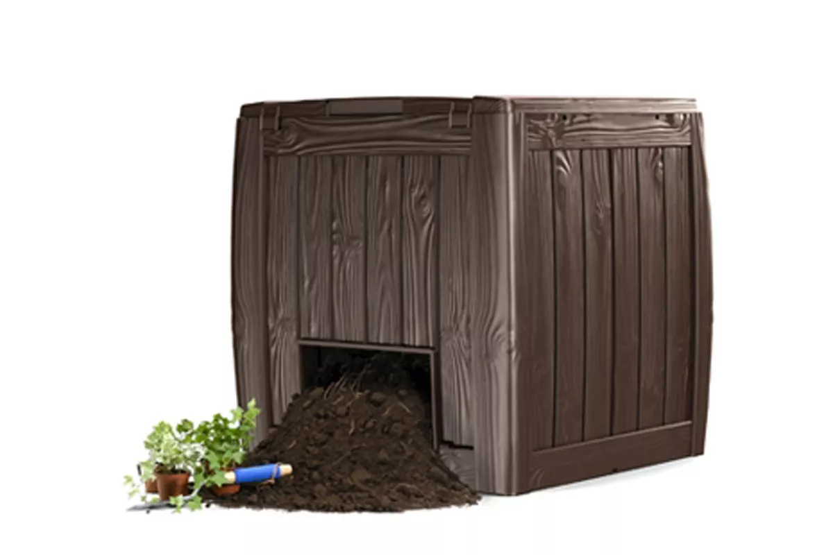 Практичная и стильная альтернатива компостным ямам от KETER. Небольшой компостер из пластика стилизованный под дерево, может быть установлен в любом месте дачного участка.