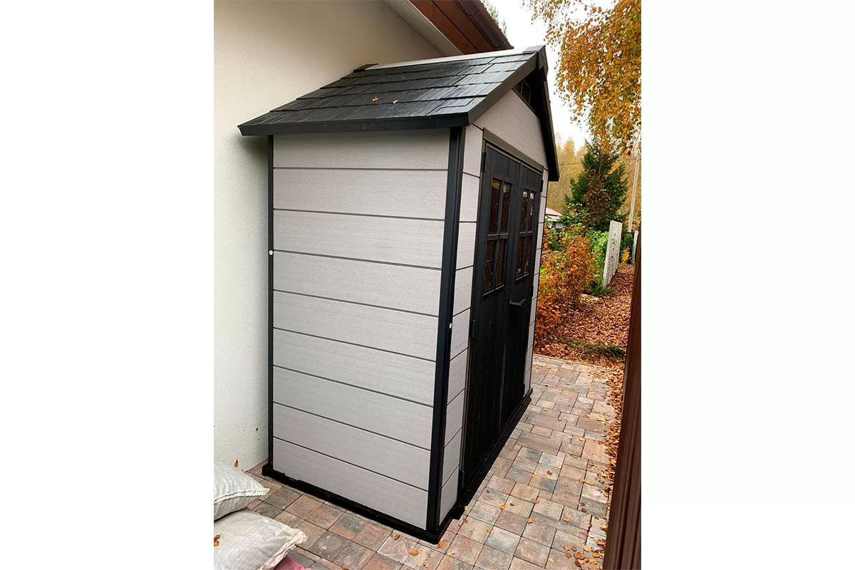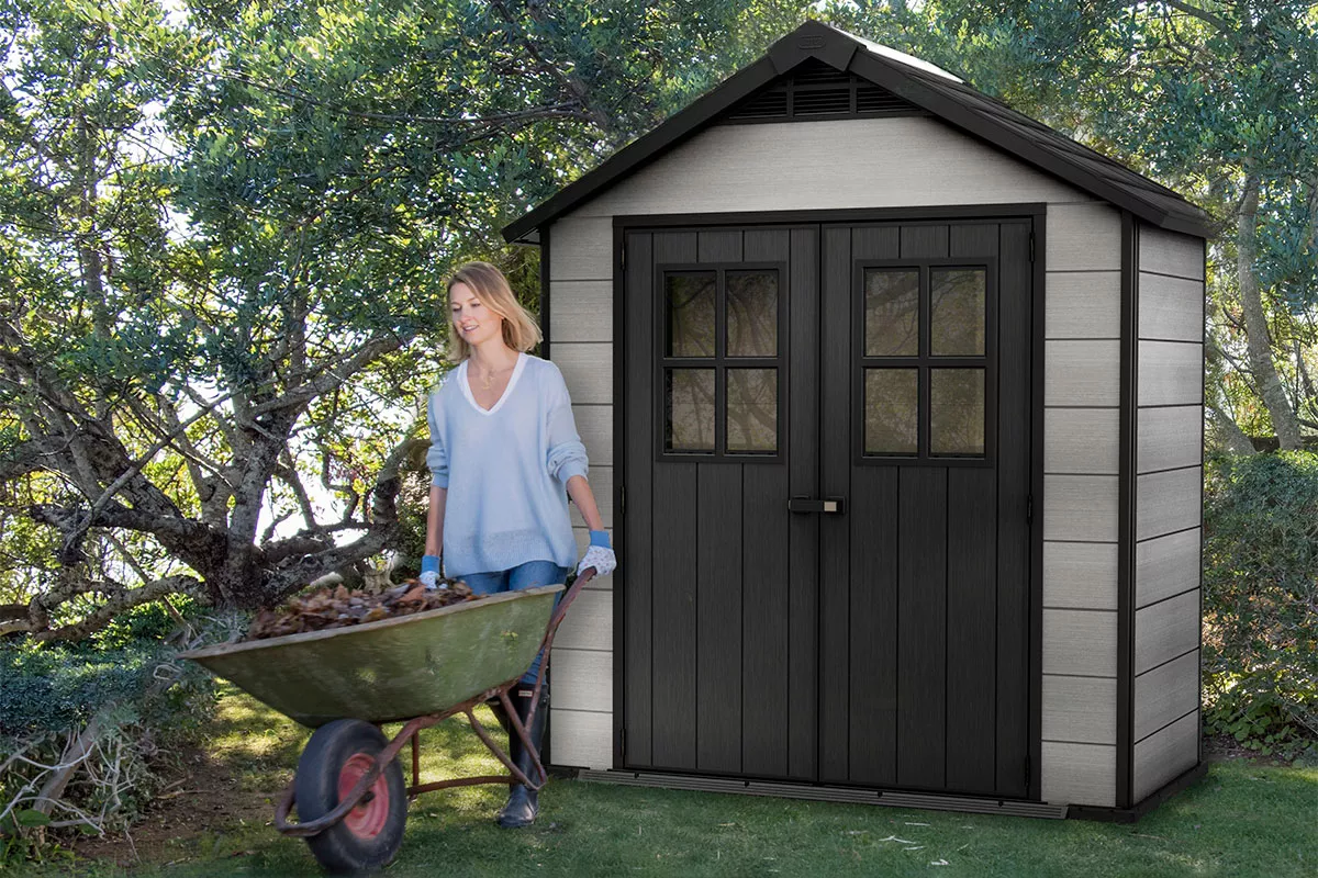 Конструкция домика, изготовленного с применением технологии DUOTECH™, устойчива к погодным условиям и выдержит любую непогоду. Сарай останется в прекрасном состоянии, несмотря на дождь, снег или яркое солнце. Прочная напольная панель позволяет хранить тяжелое оборудование, например, квадроциклы, газонокосилки и садовую мебель без риска их загрязнить или залить дождевой водой. Через широкие двухстворчатые двери легко вынимать снаряжение для повседневного использования. Благодаря тому, что в нем много естественного света и свободного пространства, домик также может служить в качестве рабочего места для тех, кто любит мастерить.