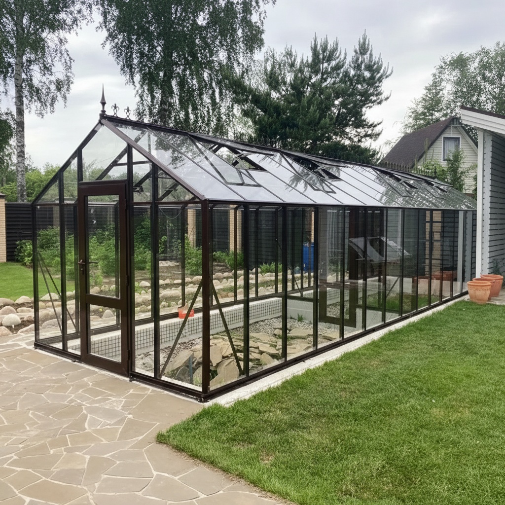 Стекло, используемое для покрытия, отличается высокой прозрачностью и долговечностью: оно не мутнеет и не теряет свойств со временем. В такой теплице легко поддерживать стабильный микроклимат, создавая оптимальные условия для овощей, ягод, зелени и цветов.