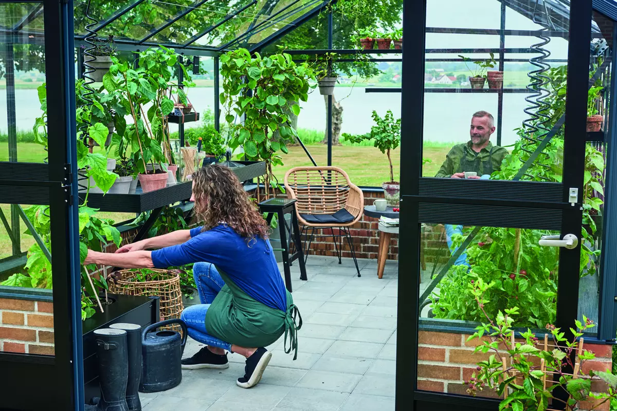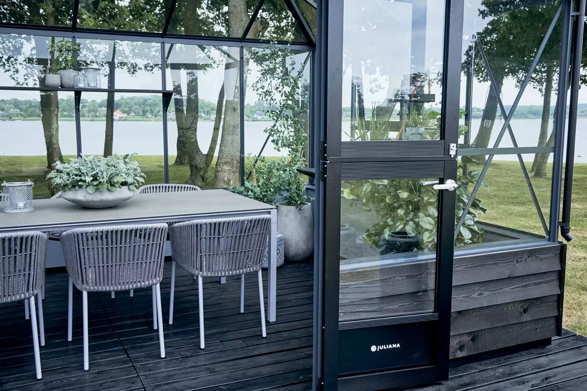 Главная особенность модели — высокий цоколь, который добавляет конструкции визуальную завершённость. Каркас Juliana Premium выполнен из усиленного алюминиевого профиля, окрашенного в глубокий цвет антрацит методом порошкового напыления. Покрытие изготовлено из 4-миллиметрового закалённого стекла, обеспечивающего высокий уровень прочности и светопропускания. Увеличенная высота стен — 172 см — делает теплицу просторной и удобной для ухода за растениями.