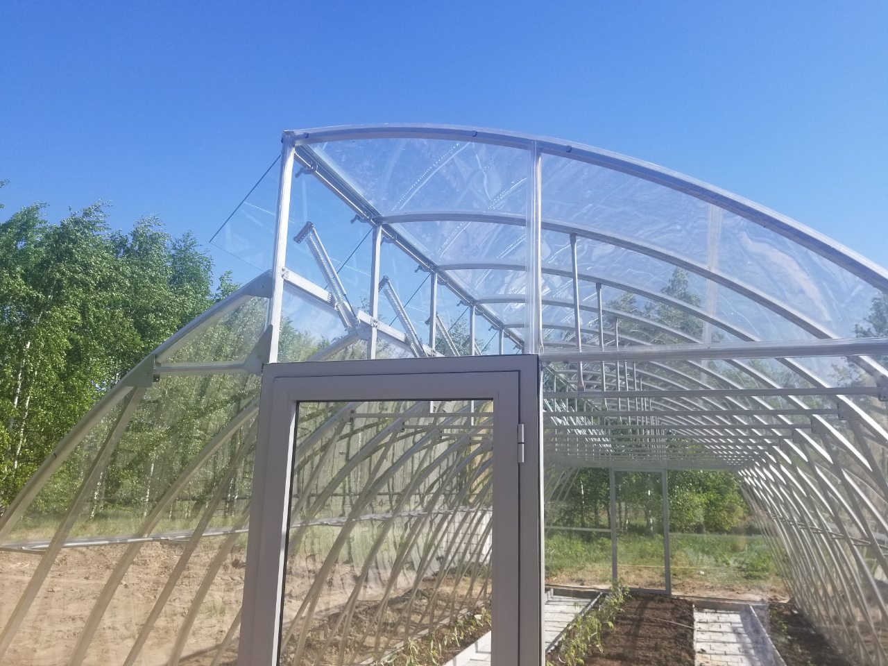 В комплект с теплицей входят крепежные элементы конструкции и соединительный профиль для стекла. В базовой конструкции предусмотрены одна распашная дверь и 4 оконные створки с термоприводом (автоматическое проветривание).