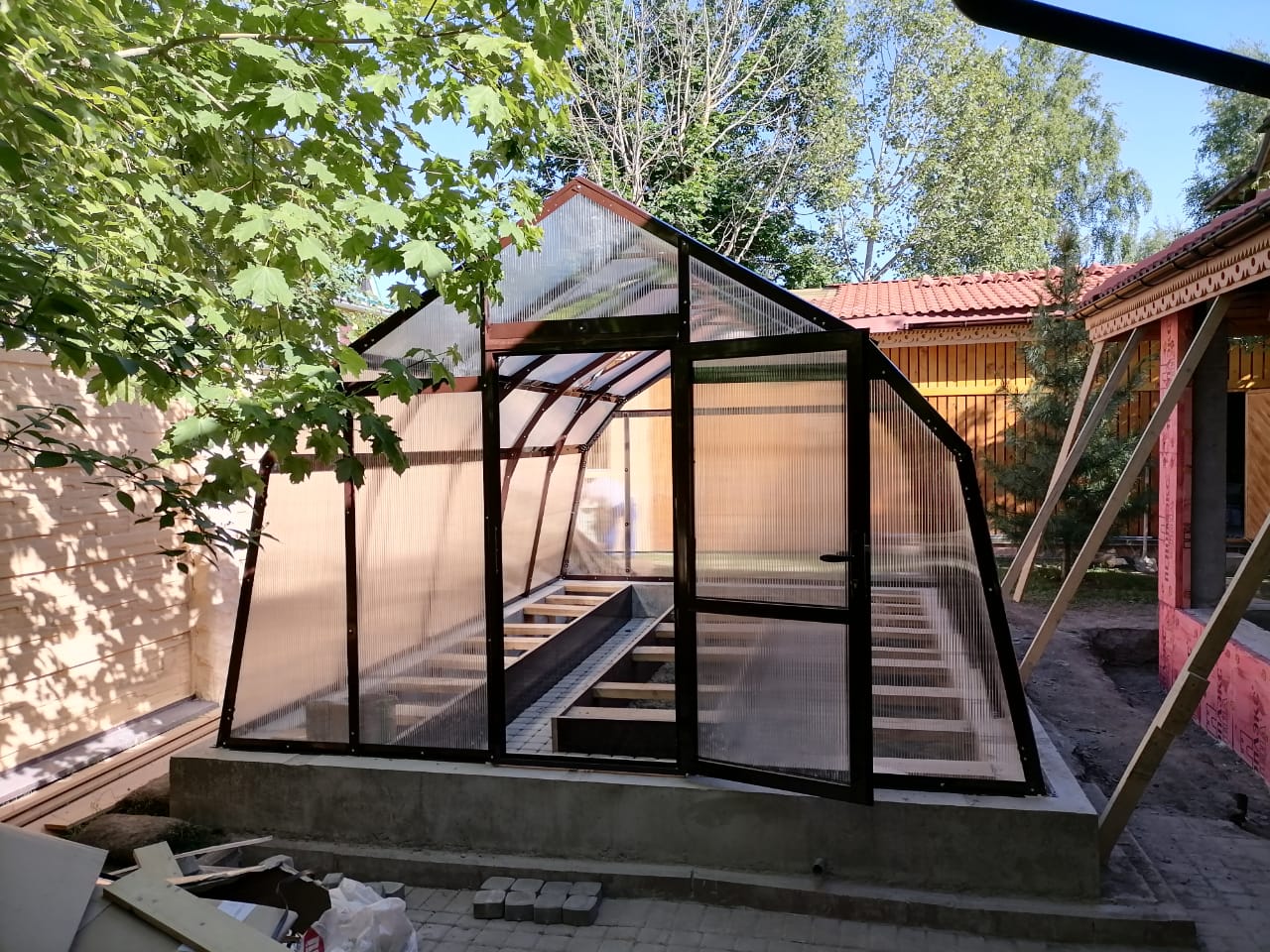 Модель отличается современным лаконичным дизайном с аккуратными линиями и строгими формами. Возможность окрасить каркас позволяет теплице гармонично смотреться как в классическом саду, так и на участке с современным ландшафтным дизайном.